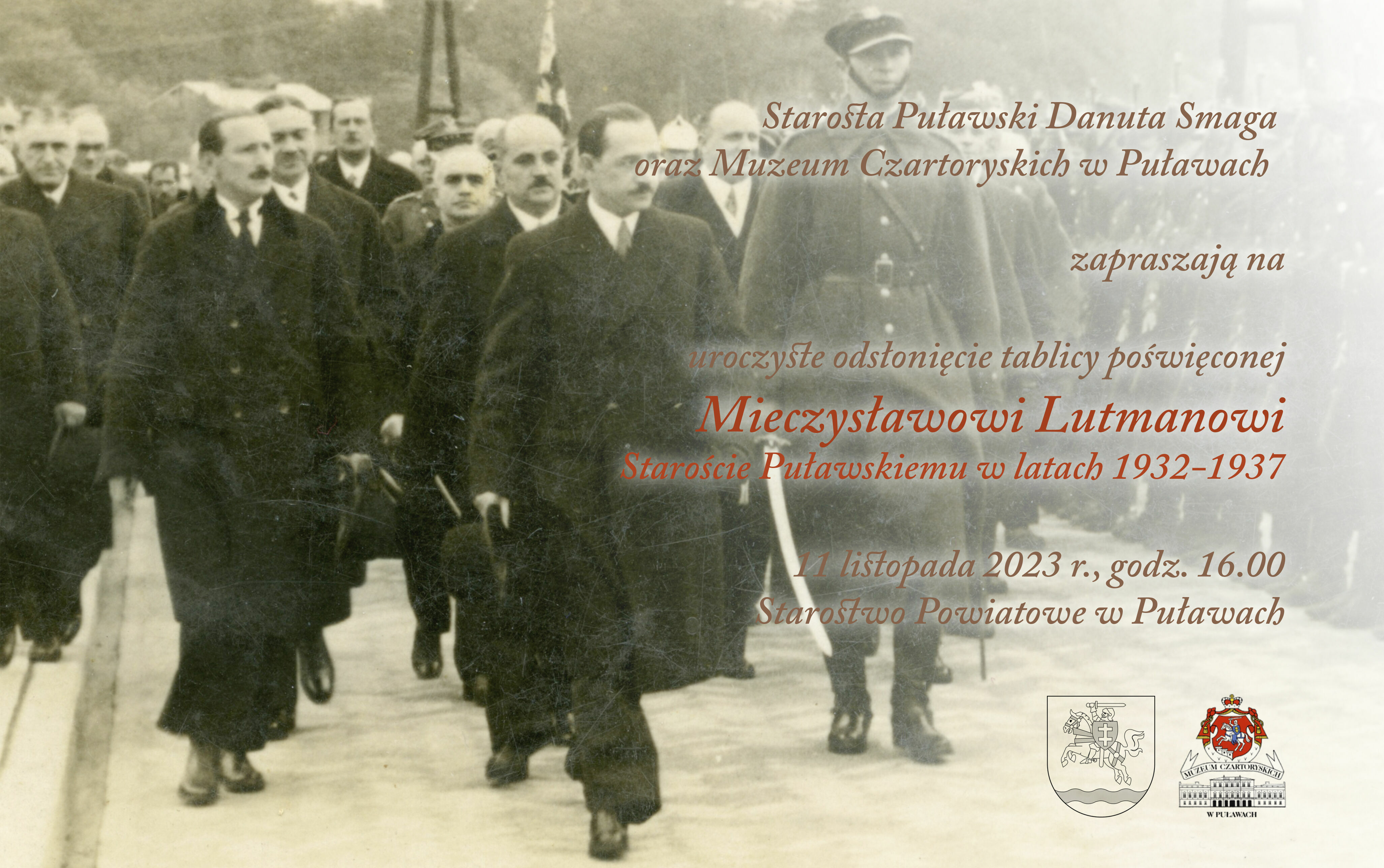 Starosta Puławski Danuta Smaga oraz Muzeum Czartoryskich w Puławach zapraszają na uroczyste odsłonięcie tablicy poświęconej Mieczysławowi Lutmanowi – Staroście Puławskiemu w latach 1932-1937.